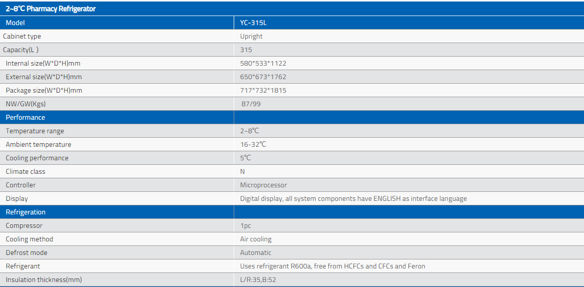 2 to 8 degree pharmacy refrigerator YC-315L is designed with multi-duct vortex refrigeration system promising fast refrigeration. And the finned evaporator can optimized the refrigerating capacity and speed of the refrigerator system. This medical refrigerator can perfectly improve the temperature uniformity to a large extent and prevent the frost completely.