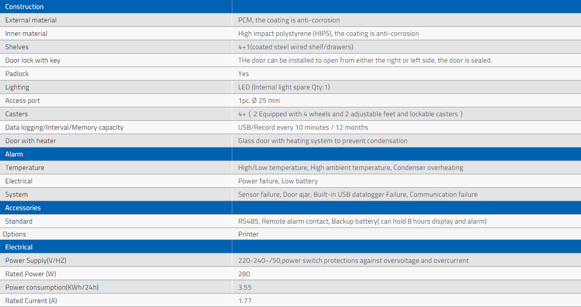 This medical or vaccine refrigerator comes with multiple audible and visible alarm functions, including high temperature alarm, low temperature alarm, low battery alarm, power failure alarm, door ajar alarm, communication failure alarm and high air temperature alarm.
