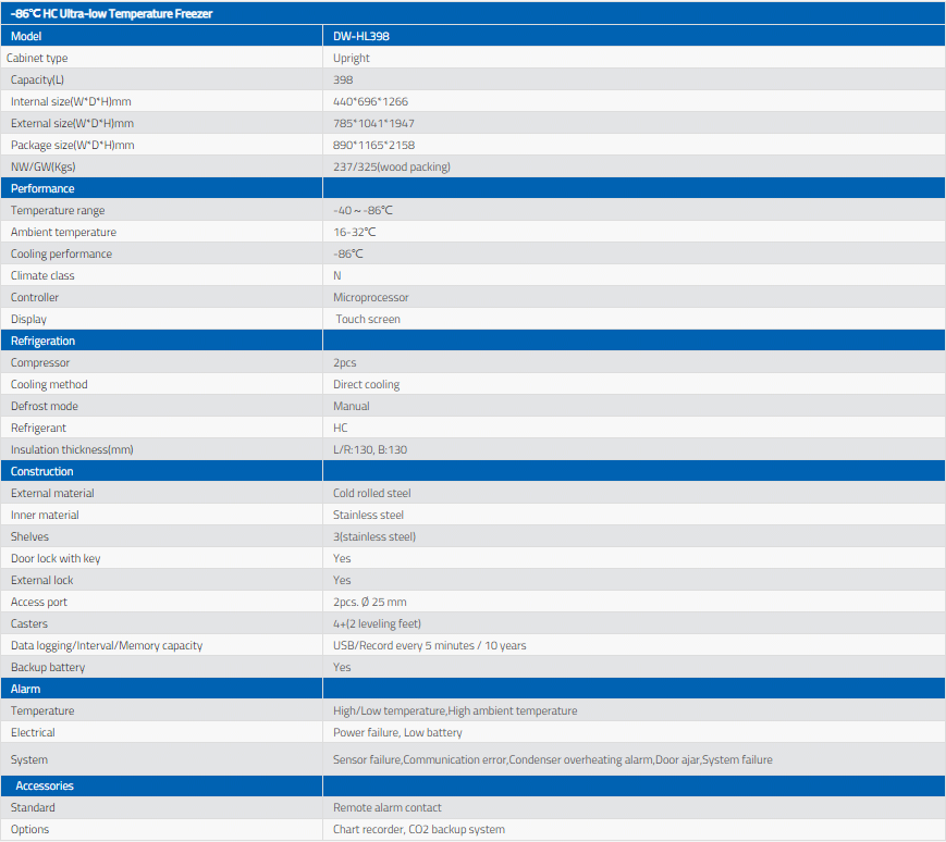 Meling -86°C HC ultra low temperature freezer DW-HL398 brings super updates in ultra low temperature freezer series. The new structure of the deep freezer for laboratory and medical comes with 2 independent inner doors. The optimized foaming insulation inside the doors provides better temperature performance. This ultra low freezer/ lab freezer is specially designed to meet the demands for long-term and safe storage of the high-valued medical and laboratory materials.