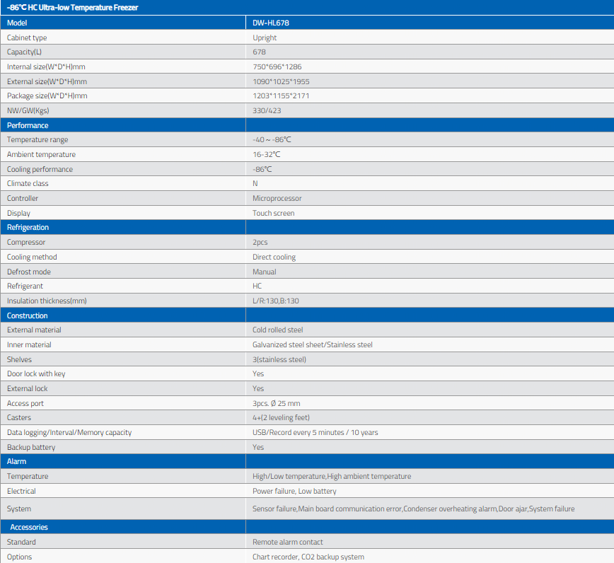 Meling -86°C HC ultra low temperature freezer DW-HL678 brings super updates in ultra low freezer series. The new structure of the deep freezer for laboratory and medical comes with 4 independent inner doors. The optimized foaming insulation inside the doors provides better temperature performance. This ultra low freezer/ lab freezer is specially designed to meet the demands for long-term and safe storage of the high-valued medical and laboratory materials.