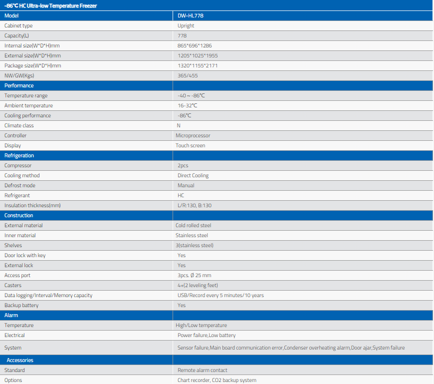 Meling -86°C HC ultra low temperature freezer DW-HL778 brings super updates in ultra low freezer series. The new structure of the deep freezer for laboratory and medical comes with 4 independent inner doors. The optimized foaming insulation inside the doors provides better temperature performance. This ultra low freezer/ lab freezer is specially designed to meet the demands for long-term and safe storage of the high-valued medical and laboratory materials.