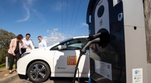 Lake Macquarie Mayor Kaye Fraser, EVSE founder Brendan Wheeler and Shortland MP Pat Conroy charge up at the Redhead Beach charger.