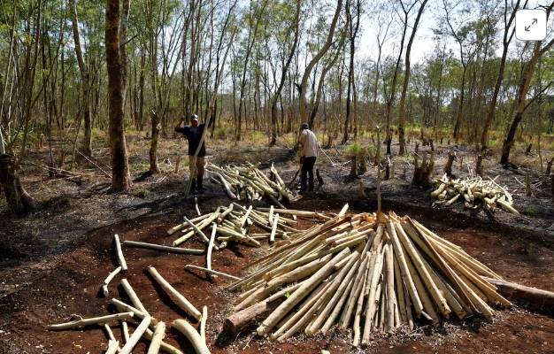People prepare to burn wood to produce charcoal at a traditional charcoal factory in San Nicolas de Bari, Cuba, February 18, 2025.