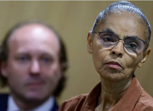 Brazil's Minister of Environment Marina Silva reacts near Rodrigo Agostinho, President of the Brazilian Institute for the Environment and Renewable Natural Resources (IBAMA), during a event in Brasilia, Brazil, February 27, 2025.