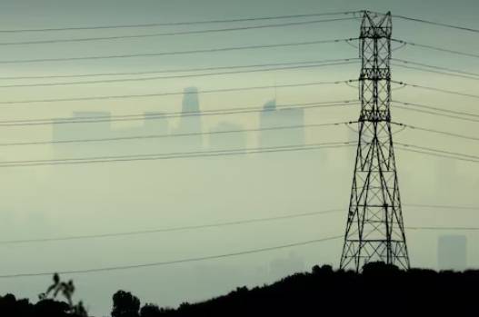 Downtown Los Angeles is seen behind an electricity pylon through the morning marine layer in Los Angeles, California, U.S., August 20, 2019.