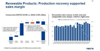 Europe accounted for 69% of renewable diesel and SAF sales in Q1 2025, up from 51% in Q1 2024, while North America’s share fell to 31% from 49%. Neste noted reduced U.S. biobased diesel production due to regulatory uncertainties and changes in tax credit structures. In Europe, renewable diesel market conditions improved as refineries resumed operations after outages.