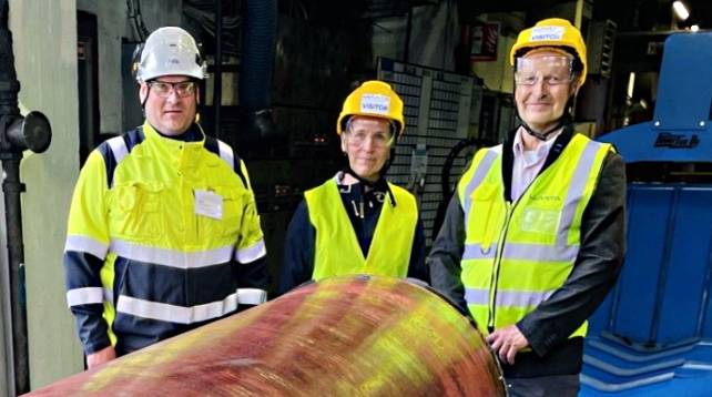 The initial blank, weighing over 17 tonnes, was completed in a single shift. Preliminary analysis samples were taken before the blank was measured and weighed. It will now undergo sawing to trim its front and rear ends, with sample slices cut for material analysis. Jouko Lammi, Posiva’s canister manufacture coordinator, stated: “The casting process was a great success. A good casting quality is important for the subsequent canister production phases. New investments have been made in the foundry to improve the quality and the processing of the casting. One of the most important accomplishments has been the increase in the diameter of the casting with a larger gravity die.”