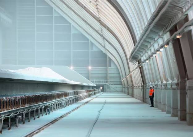 A view shows a finished product warehouse at a processing plant of fertilizer producer EuroChem VolgaKaliy developing the Gremyachinskoe potash deposit in Volgograd region, Russia September 3, 2024.