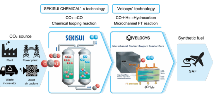 Wedoany.com Report-Aug. 27, Sekisui Chemical Co. Ltd., based in Osaka City, Japan, and Velocys Inc., headquartered in Houston, Texas, have signed a memorandum of understanding to collaborate on advancing production technology for electro-Sustainable Aviation Fuel (e-SAF). This partnership integrates Sekisui’s CO2-to-CO chemical looping technology with Velocys’ Fischer-Tropsch microchannel reactor technology to produce synthetic fuel from CO2, contributing to global efforts to reduce carbon emissions in the aviation sector.