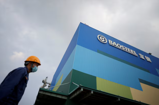 An employee stands near a Baosteel logo during a government-organised media tour to Baoshan Iron & Steel Co., Ltd. (Baosteel), a subsidiary of China Baowu Steel Group, in Shanghai, China September 16, 2022.