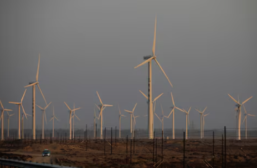A car drives near wind turbines on a power station near Yumen, Gansu province, China September 29, 2020. Picture taken September 29, 2020.