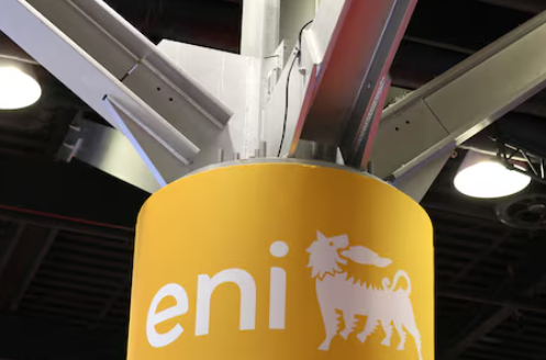 The logo of Italian multinational energy company Eni is displayed at their booth during the LNG 2023 energy trade show in Vancouver, British Columbia, Canada, July 12, 2023.