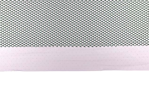 Close-up of Greenflow HM-P16 hybrid flow mesh product, showing the pink perforated P16 release film bonded to the underside of Expo-Net’s green resin flow mesh.